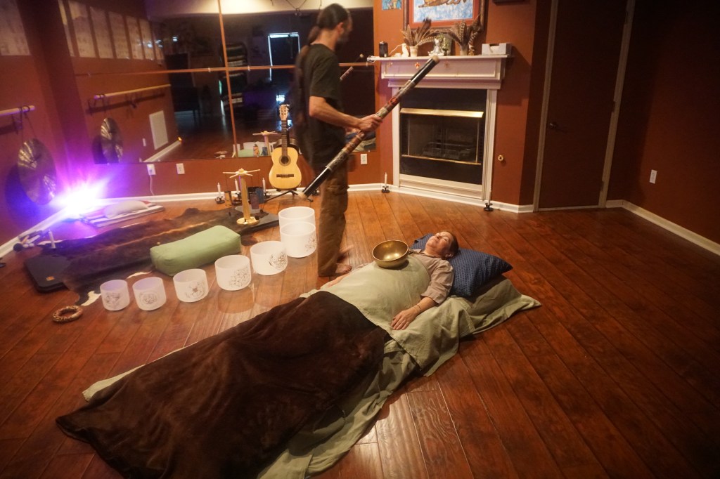 Aaron is a musician first. He taught himself guitar at age 12 and has spent his life in love with sound — what it does to a room, to a body, to a mood. Sound bath healing wasn’t a departure from that. It was a natural next step.